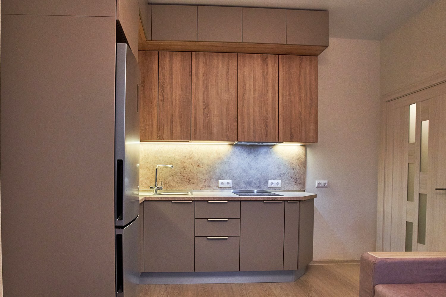 Большое внимание мы уделяем качеству наших изделий, используем лучшие материалы и уникальную систему сборки мебели. Чтобы обеспечить надежность конструкции, каркасы кухонных шкафов склеиваются на производстве с помощью специальных станков и доставляются вам в собранном виде. Клееные корпуса кухонь — это новинка на российском рынке, мы уже привыкли, что мебель поставляют в разобранном виде, что не всегда удобно. Заказав кухню у нас, вы будете приятно удивлены. Готовые клееные модули гораздо крепче, их проще и быстрее собирать. Готовые модули кухни герметично упаковываются с помощью термоусадочных станков. Это защищает мебель при транспортировке от механических повреждений, воздействия влаги и перепада температур.