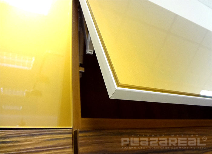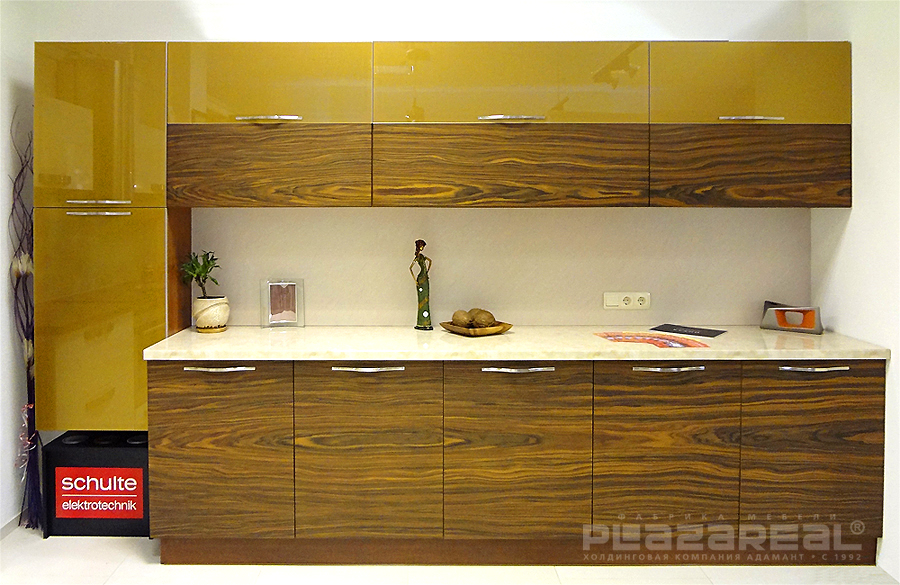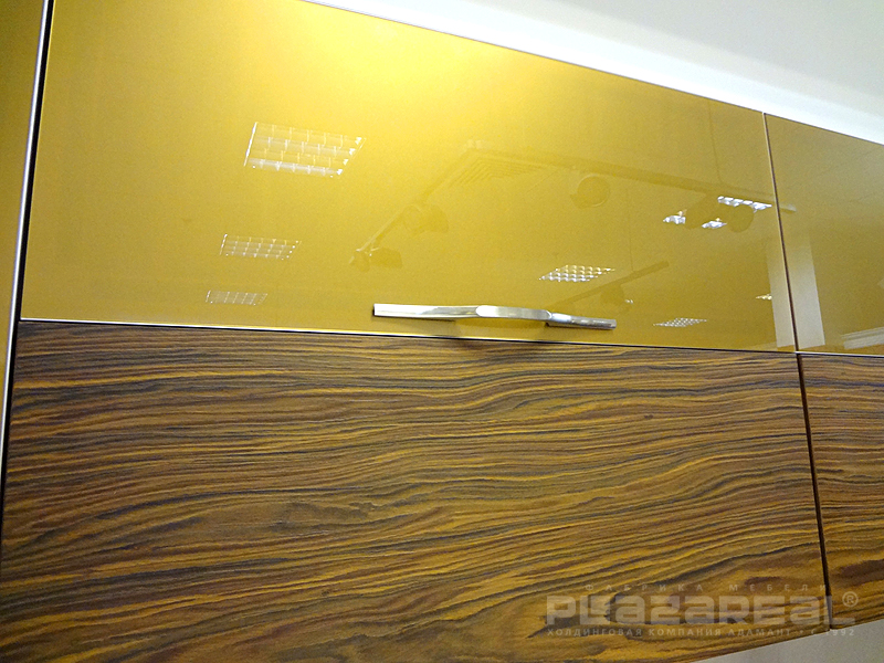 Со стеклом прекрасно комбинируются:- шпонированные фасады древесных декоров кухни «Лата» (на фото) и «Марта»;